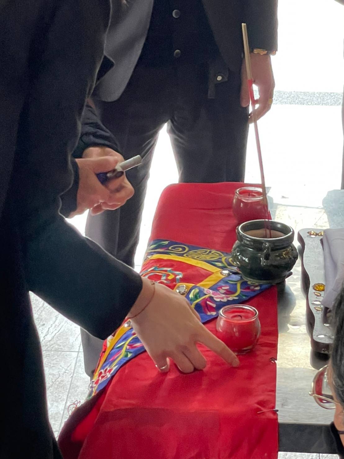 這次的告別式亡者為80歲的女姓,依傳統習俗要做接外家的禮俗,我終於見識到跪請舅父了,清晨四點,第一次很麼早起床呀!搭公司的車趕著到告別式,到了第二殯儀館佈置告別式會場,第一次接觸到了五牲,五牲現在可是少見的,而且大多見到都是在大型的祭祀活動或是位階較高的神明祭祀活動才看得到,前輩對我解釋道:「這是出嫁女兒準備的」,因為有擺放的規則也是第一次學到,由於每個地區都不一樣,所以擺放方式也不同我第一次學習到,完完整整整理好之後沒多久,家屬到了儀式就開始,學長與司儀對家屬說一些注意事項,等舅舅到時家屬開始跪請舅父儀式,而且這一場也是難得穿傳統孝服,所以很多的禮節都是以傳統為主,這也是為什麼我可以看見跪請舅父的原因。